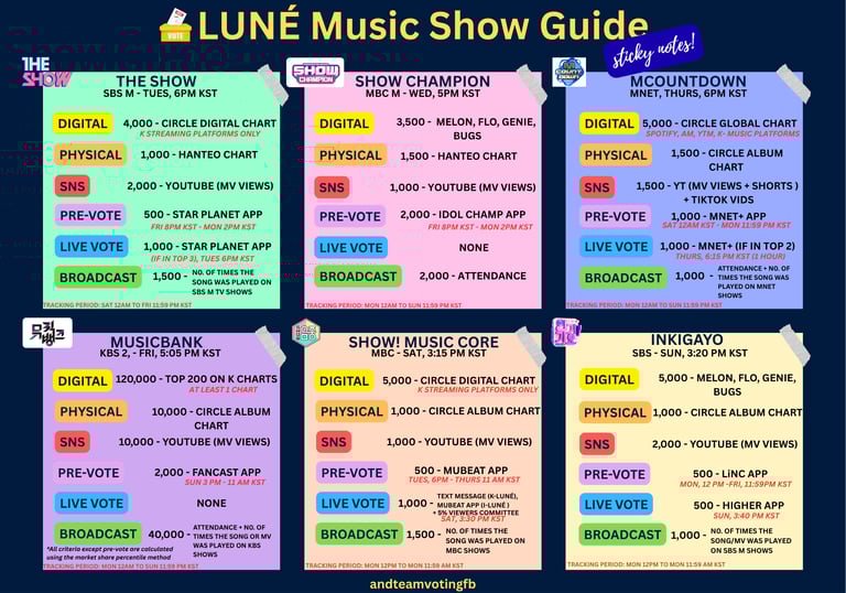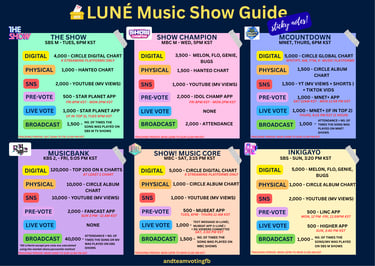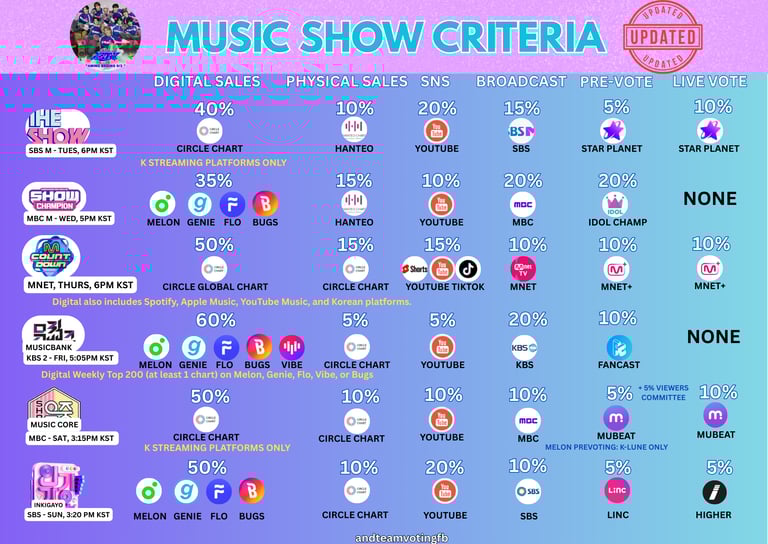This section shows how each music show counts votes toward rankings. The criteria include digital streams, album sales, SNS, broadcast points, and fan votes. Please review carefully so we can focus our efforts where they matter most.